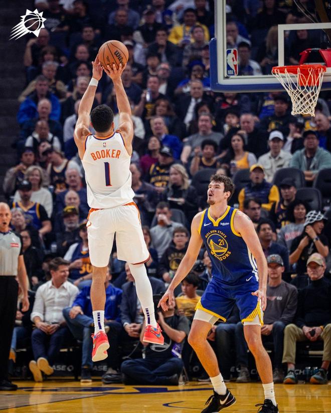 布克上半场砍下了17分,第3节再得17分。末节,布克还在努力追分。在布克的率领之下,太阳一度看到了逆转取胜的曙光。不过,穆迪、库里的稳健发挥,让布克全场的努力功亏一篑。